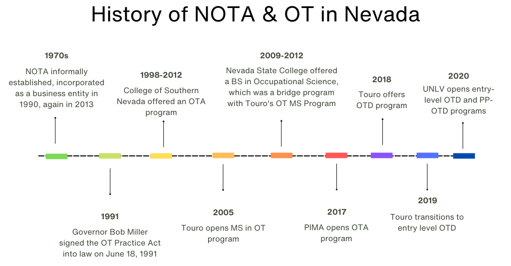 Occupational therapy practitioners in Nevada serve clients in a variety of health care settings. Our health care system has struggled to keep up with the booming population, and our supply of occupational therapists is in high demand. This means you get paid well as an OT or OTA, but may work across settings or have little time at work to connect with other occupational therapy practitioners. Our legislature here only meets every two years, so if we want a change in scope of practice, we need to be organized and proactive.
