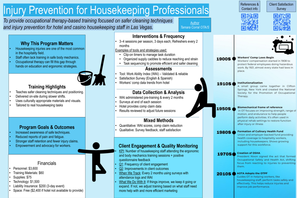 This is a comprehensive OT initiative aimed at reducing injuries among Las Vegas hotel and casino housekeeping teams through a bilingual, union‑supported training program led by an OTA under OT supervision. The curriculum combines education on musculoskeletal injury risk factors and OSHA‑like ergonomics with hands‑on training and use of long-handled or adaptive tools, tailored to common housekeeping tasks such as bed‑making, vacuuming, and bathroom cleaning. Sessions are scheduled during slower shifts in hotel banquet rooms and coordinated with HR and the Culinary Union to minimize disruption. Its long-term impact includes fewer back, shoulder, and wrist injuries, reduced leave time, and improved job satisfaction and retention, while challenges like language barriers, scheduling logistics, and employer buy‑in are addressed via translated materials, schedule flexibility, and union engagement. This approach aligns with best practices in occupational therapy for workplace wellness and ergonomic interventions to prevent hotel housekeeping musculoskeletal injuries.