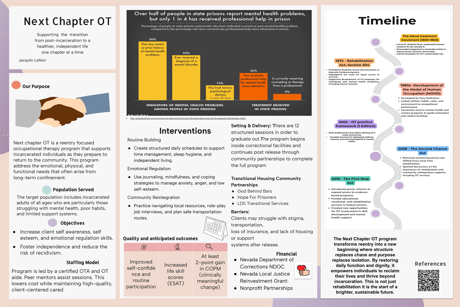Next Chapter OT is a program designed to help people in prison get ready for life after release. It focuses on improving daily routines, emotional health, and life skills, so individuals can live more independently and avoid returning to jail. The program includes 12 structured sessions that start inside the facility and continue after release through partnerships with local organizations. A certified OTA, an OT aide, and peer mentors lead the sessions to keep the program affordable and supportive. Overall, it helps people build confidence, manage stress, and successfully rejoin their communities.