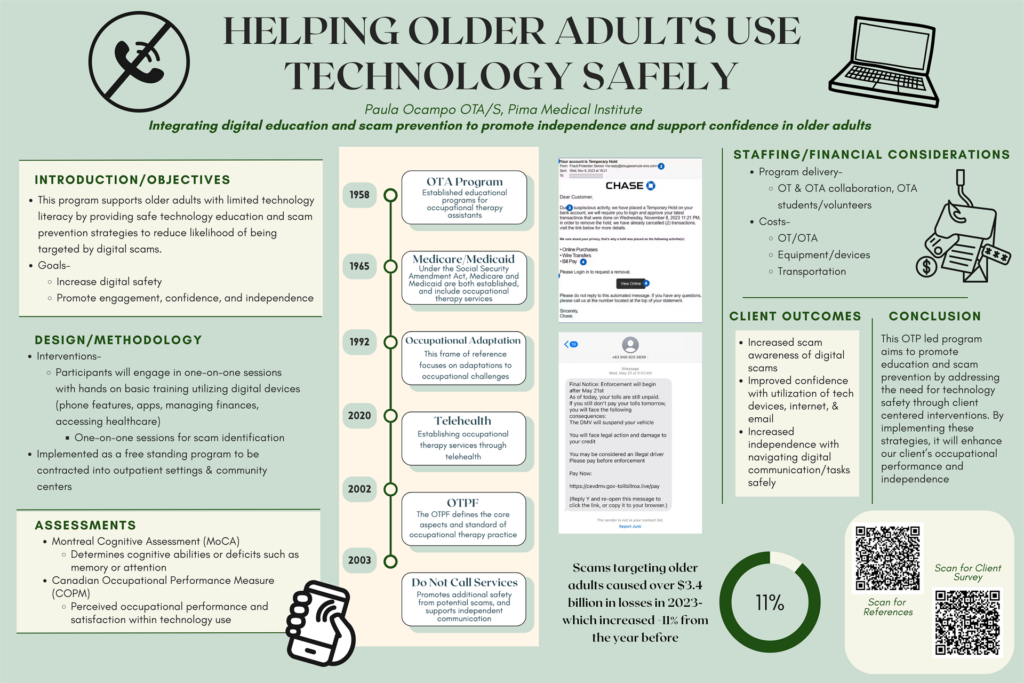 This is an OTA led program aimed at improving digital literacy and scam prevention for older adults. Through individualized, hands-on sessions, participants learn to navigate technology tools such as smartphones, online banking, and healthcare portals while also developing skills to identify and avoid scams. The ultimate goal is to enhance client safety, confidence, and independence in the digital world, thereby promoting meaningful occupational engagement and reducing vulnerability to financial exploitation.