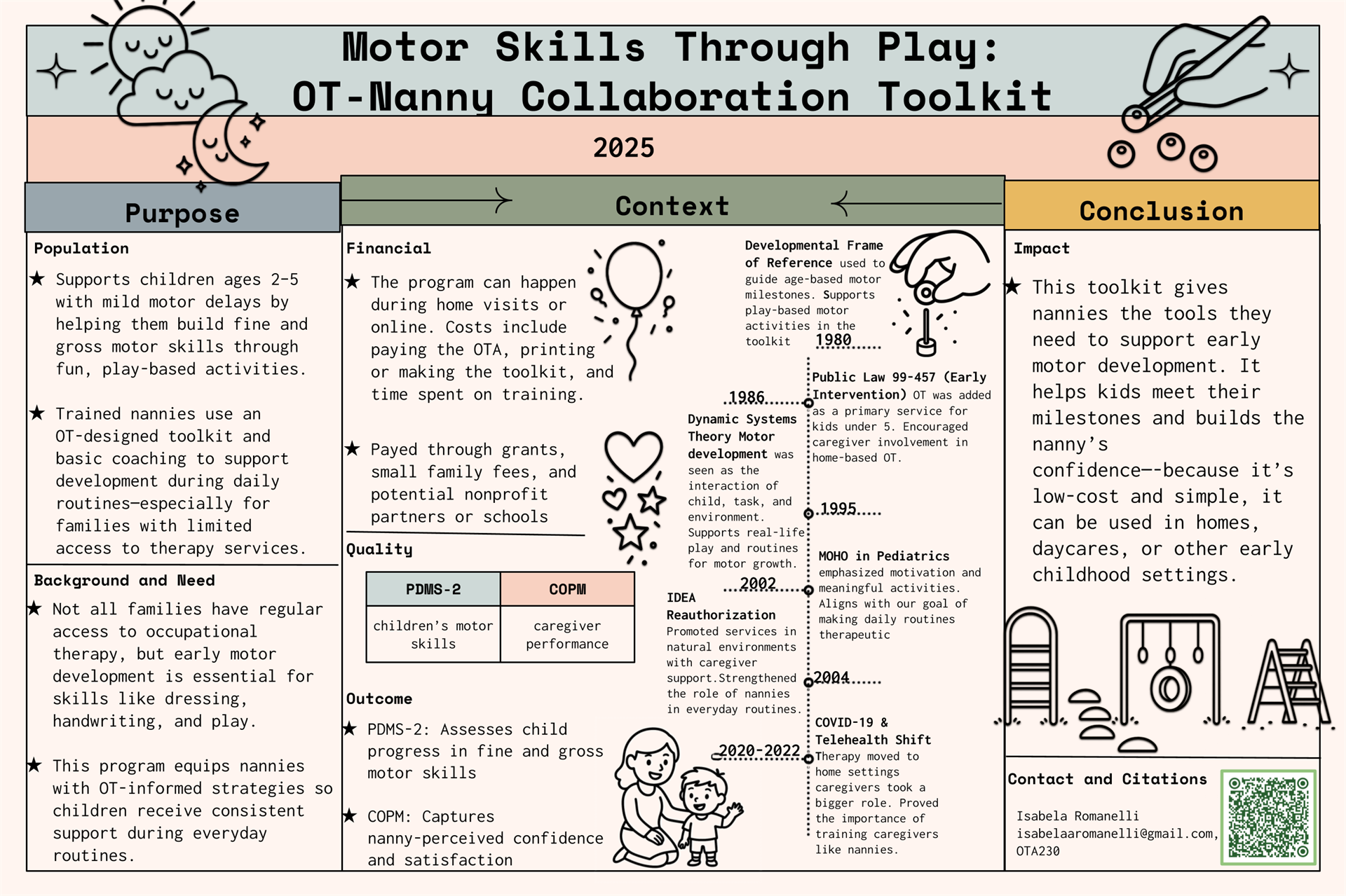 The practice area was selected as pediatric occupational therapy, with a focus on preparing children for school by developing fine and gross motor skills. This program offers nannies engaging, easy-to-implement strategies to support child development during play, daily routines, and everyday activities.