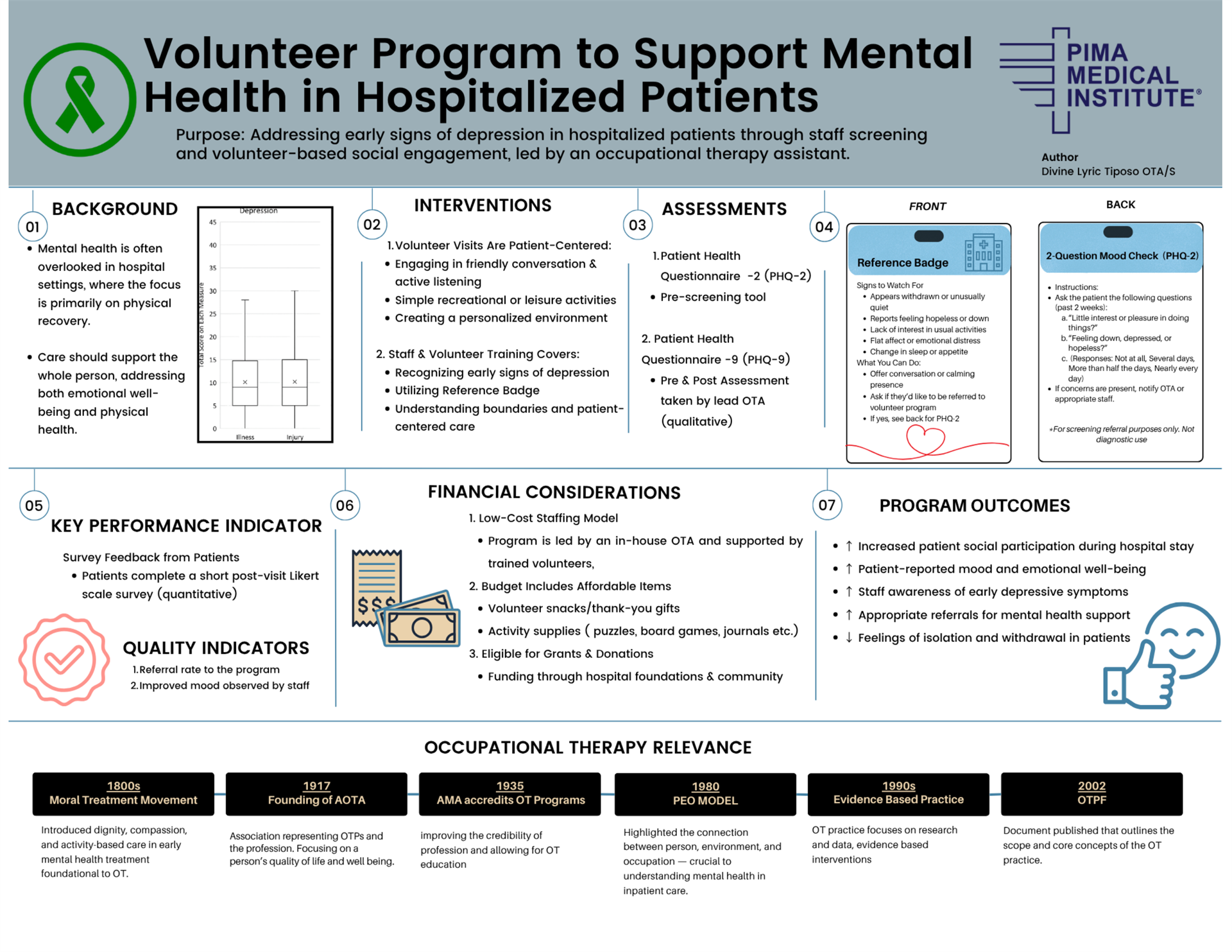 This presentation focuses on the fact that mental health is often overlooked in hospital settings, where the primary focus is usually on physical recovery. However, many patients experience emotional challenges like depression, anxiety, or isolation during their stay, which can impact their overall well-being and even delay healing. I introduced a volunteer-based program aimed at filling this gap. This ties directly into the role of occupational therapy, which looks at the person as a whole. OT focuses on helping individuals engage in meaningful activities and maintain their routines, even in challenging environments like hospitals. This program reflects OT values by supporting mental health, promoting occupational engagement, and creating a more holistic approach to patient care.